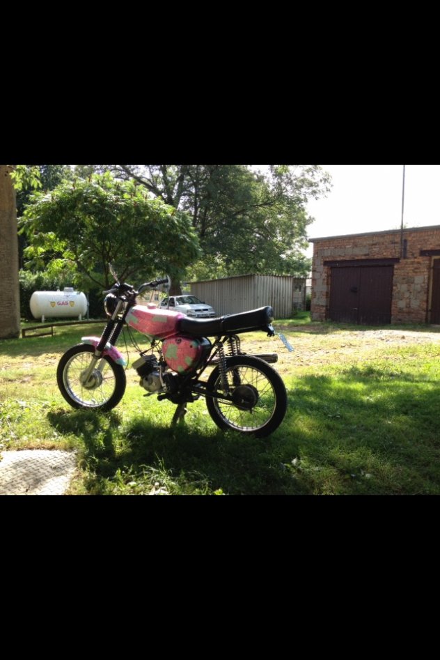 Das eine war mein Alltagsmoped mit rosa grün geklebten Tank, Seitendeckel und Schutzblech, Motor mit Drehzahlmesser und alten Kennzeichen dran