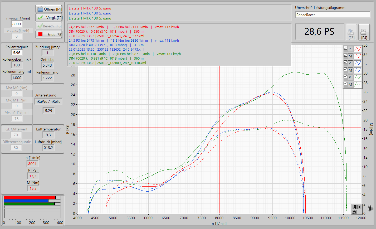 Heute alle 4 Auspuffanlagen durchgetestet! Eine (blaue Kurve) setzt noch weiter vorne und kräftiger ein- dafür mit etwas Leistungseinbuße: bis jetzt!