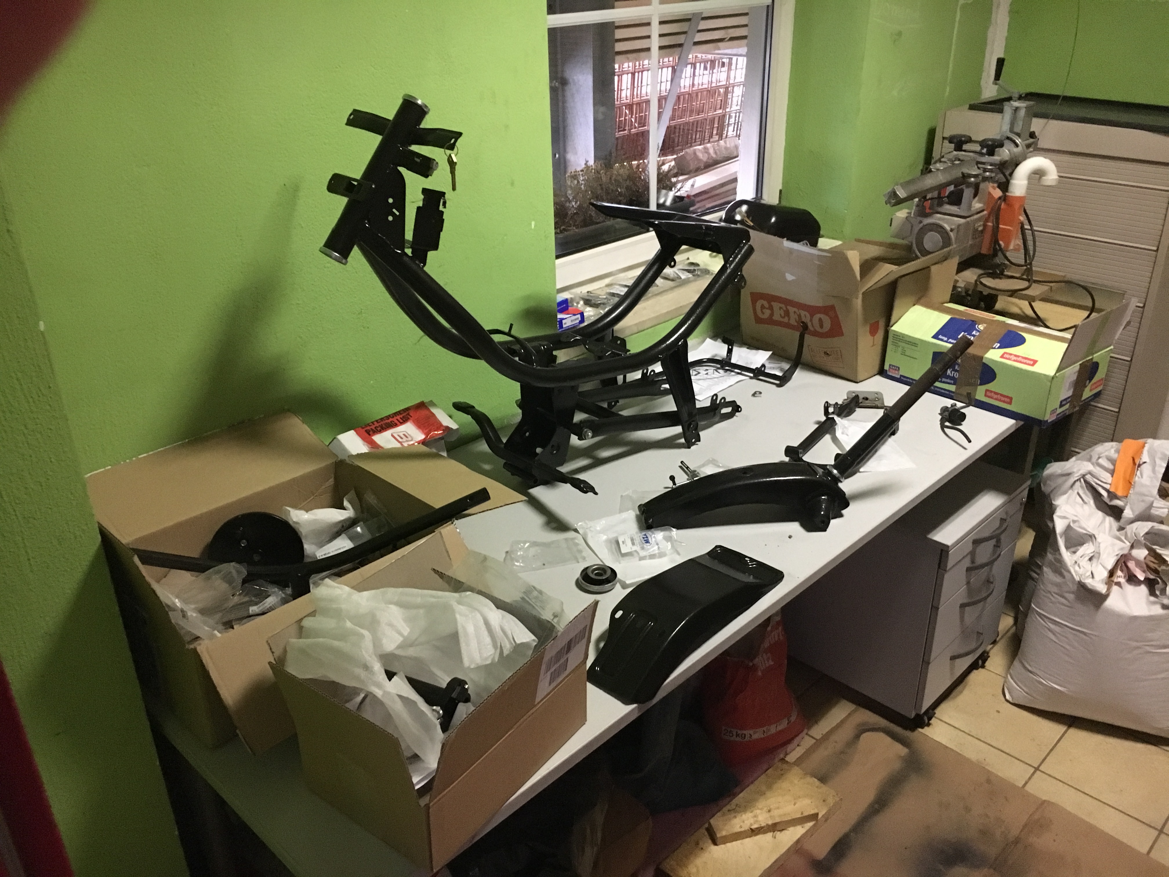 Schwalbe ist mittlerweile komplett zerlegt. Rahmen wurde gesandstrahlt und lackiert. Habe da mal das gute Wetter der letzten Tage genutzt. (Wozu so ein Baum gut sein kann)