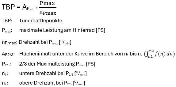Bei der Berechnung der Tuba-Punkte wird die Leistung als Menge betrachtet (Flächeninhalt unter der Kurve AP2/3). Dadurch ist es möglich, das Leistungsvermögen des Motors im Bereich von P2/3 zu bewerten. Wenn die Leistungskurve innerhalb des Drehzahlbandes (bei P2/3) einen Einbruch oder einen sehr spitzen An- bzw. Abstieg hat, so wirkt sich dies entsprechend negativ auf die Bewertung aus.