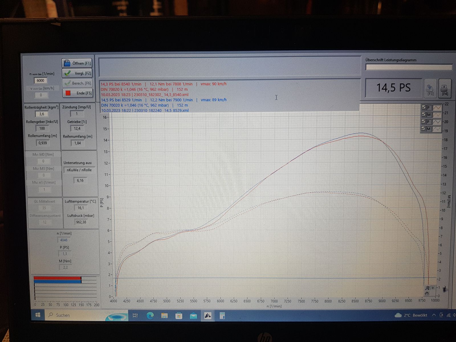 Das sind meine aktuellen Diagramme (Radleistung!) von meinem 94G, Auslass wurde bearbeitet, Überströmer und Einlass sind noch original.