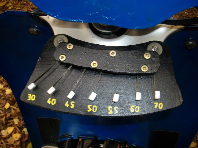 Der Scheinwerfer ist ca 10cm tief,sodas man noch einigermaßen Platz hinten hat.Da ich ein anderes Zündschloß an anderer Stelle verbauen werde und auch ein anderer Tacho eingebaut wird,habe ich noch platz für andere Gimmiks im Lampenkasten.