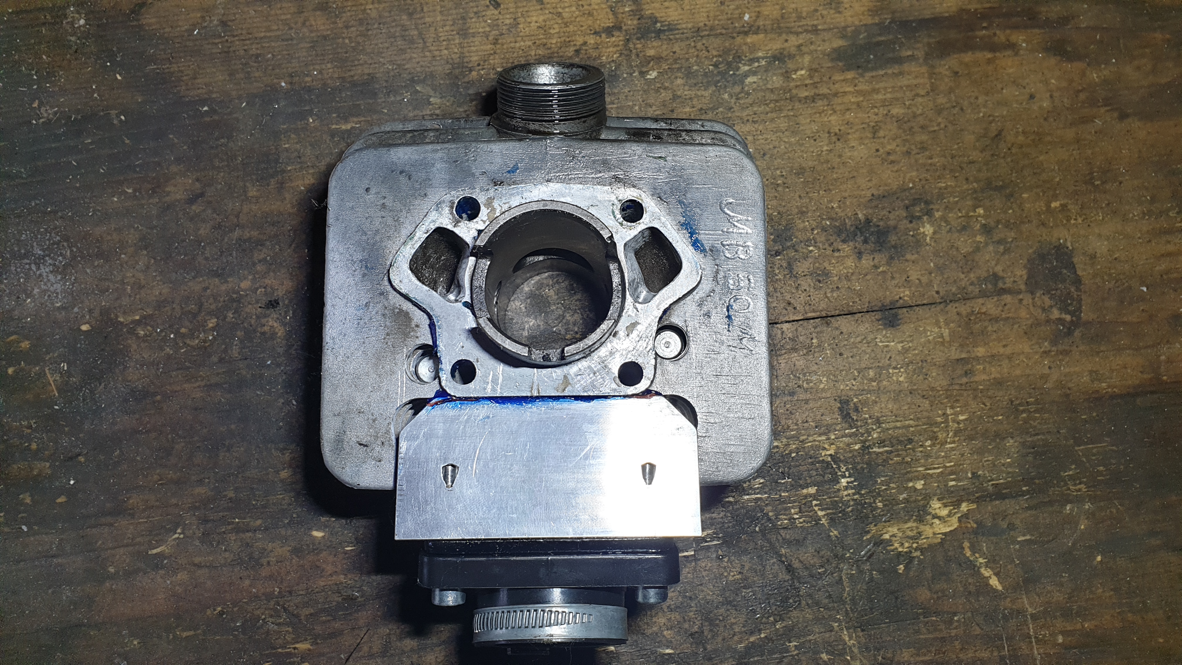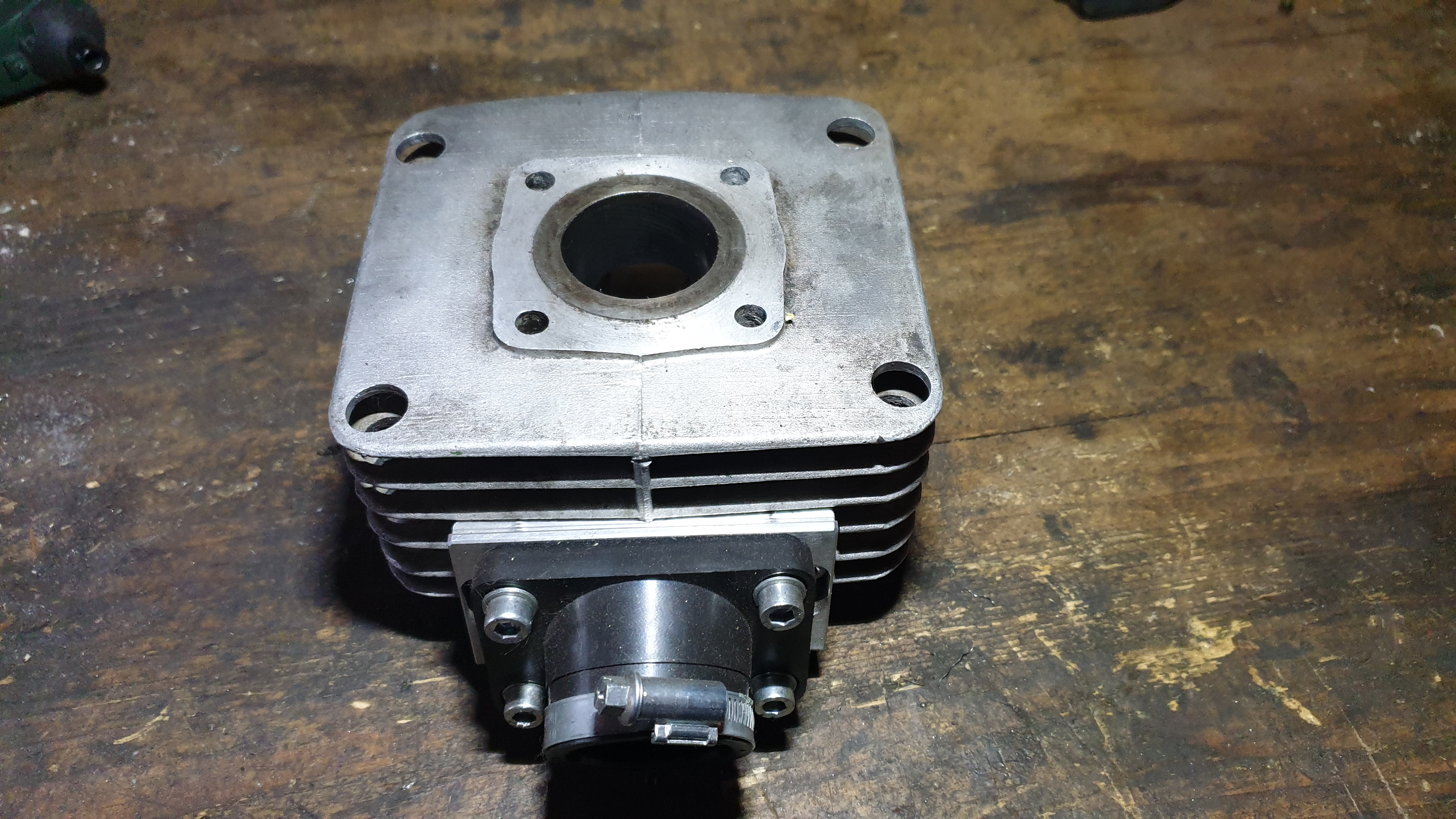 2. Der Grund für den Kauf des Zylinders ist meine Teilnahme an 50ccm MX Ausdauerrennen hier bei mir in der Nähe. Bei einer Testfahrt war ich vom Drehmoment bei niedrigen Drehzahlen sehr beeindruckt (mein erster Membraner). Nur ist mir leider beim 2. Start ein Kolbenclip gebrochen und hat den Kolben gleich mit zerstört. Die Zylinderlaufbahn ist nicht betroffen, aber ein Schliff wäre so oder so nötig gewesen.