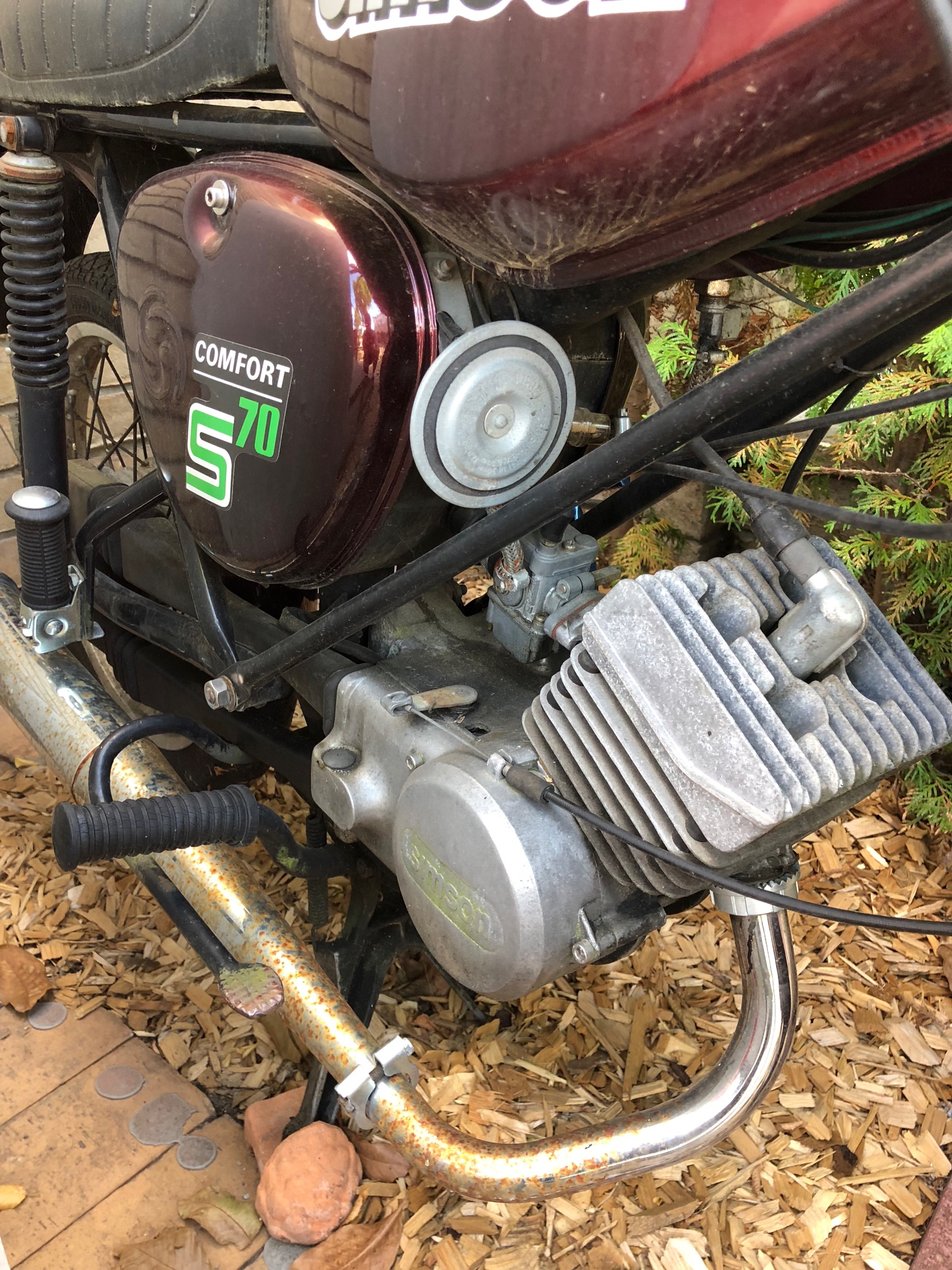 Ich habe eine Simson S70C, diese befindet sich seit knapp 10 Jahren in mein Besitz, ist aber seit ca. 6 Jahren nicht mehr Angemeldet. Motor verliert leider Getriebeöl, Kupplung trennt nicht mehr richtig, aber springt an und bin erst vor einigen Wochen die Strasse rauf und runter gefahren zum Test.