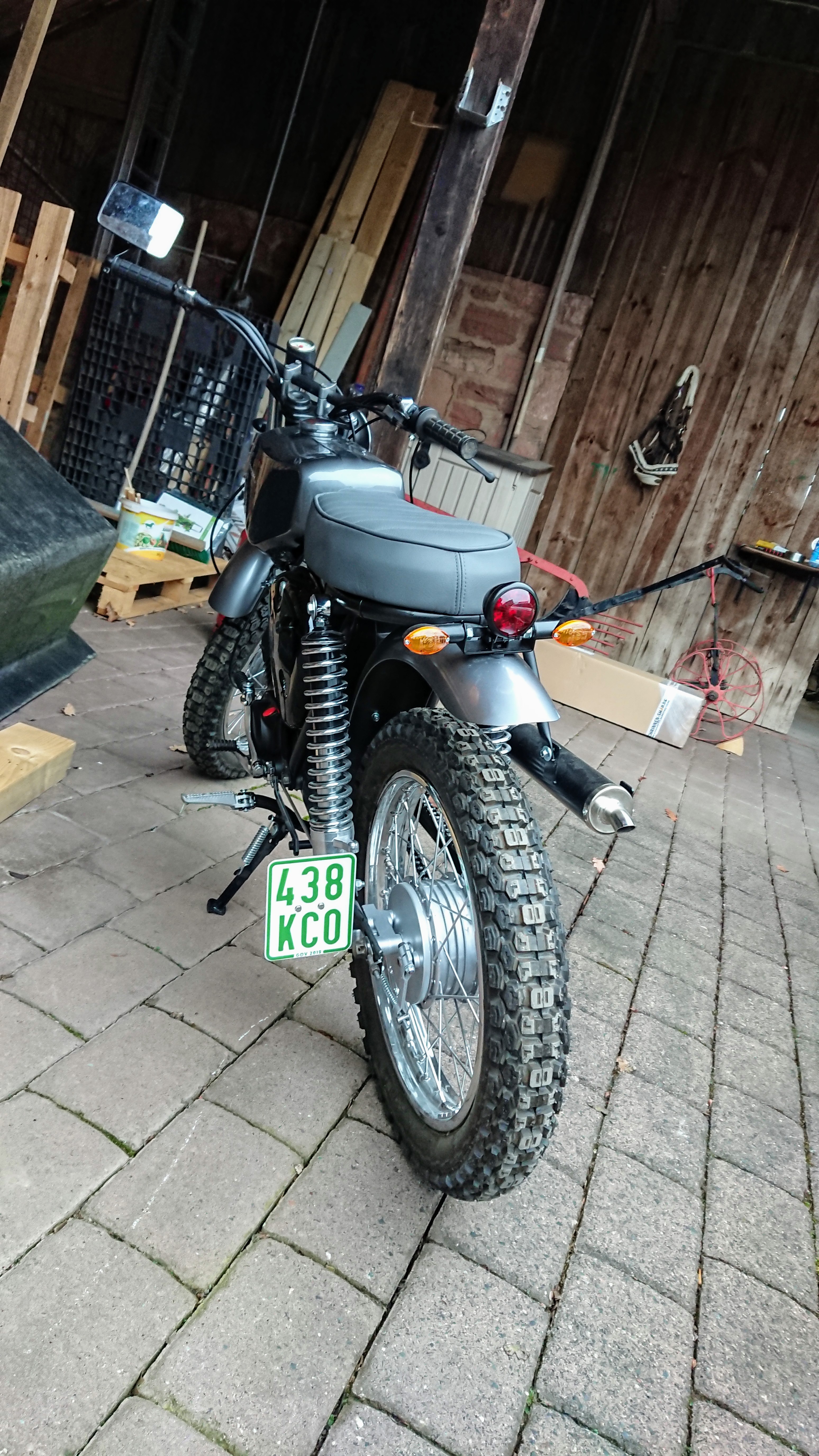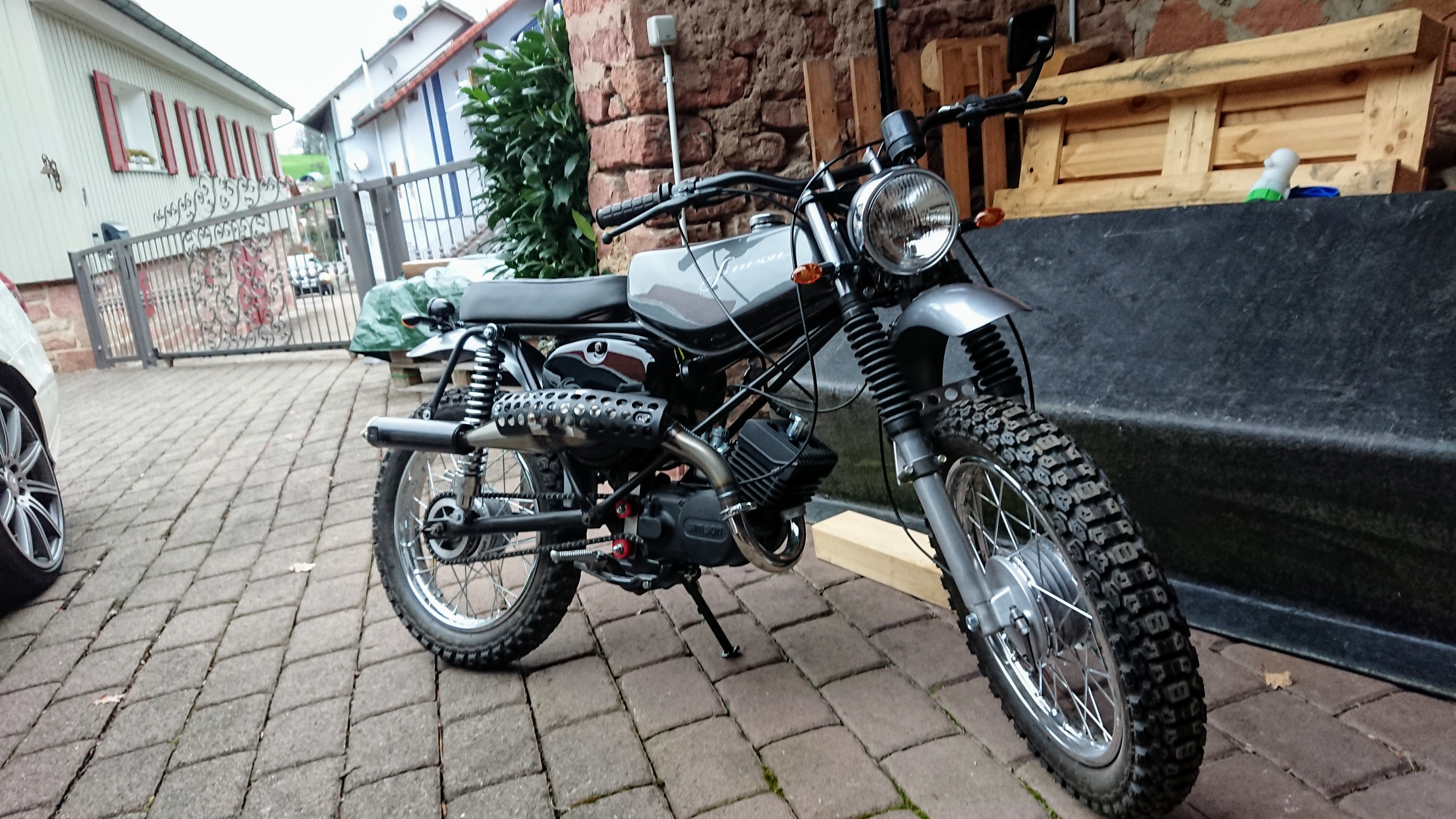 Ich möchte noch einmal betonen das es mir in erster Linie um die machbare Optik und ums Schrauben bzw. Restaurieren ging. Eben so wie es mir vorgeschwebt hat. Hatte und habe nicht die Absicht das gute Stück auf öffentlichen Straßen zu bewegen. Dafür habe ich ein "richtiges" Motorrad. Ausserdem wohnen wir "auf dem Dorf". Da gibt es genügend Feld- und Wirtschaftswege, falls einen mal die Lust packt. 😉 Nun gut, dies dazu.