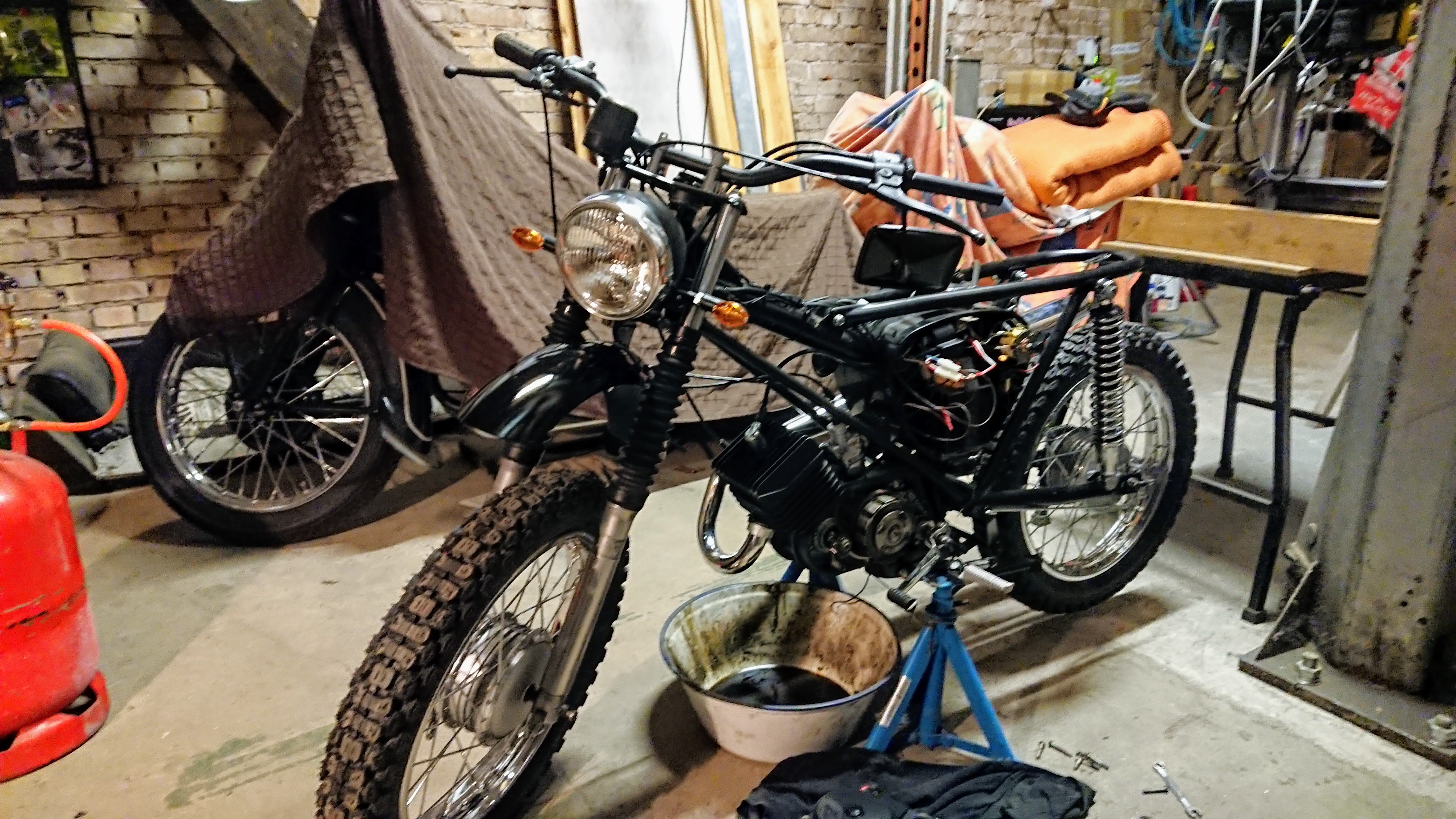 Aber nun mal zum Positiven. Gestern war dann der Tag des ersten Startversuchs. Nach dem dritten Kick lief sie tatsächlich. Lampen, Blinker etc. funktionieren wie sie sollen. Am Vergaser hatte ich lediglich die Hauptdüse getauscht. Die erste Probefahrt verlief vielversprechend. Untenrum passiert noch nicht sehr viel. Bei höheren Drehzahlen geht sie richtig ab. Da ist dann noch Feintuning notwendig. Die Tröte klingt mal richtig geil! Trägt jedoch ziemlich dick auf. Trotz Enduro-Bremshebel ist es ziemlich "umständlich" die Hinterbremse zu betätigen. Da werde ich wohl nochmal das Schweißgerät bemühen müssen und eine Verlängerung anbringen.