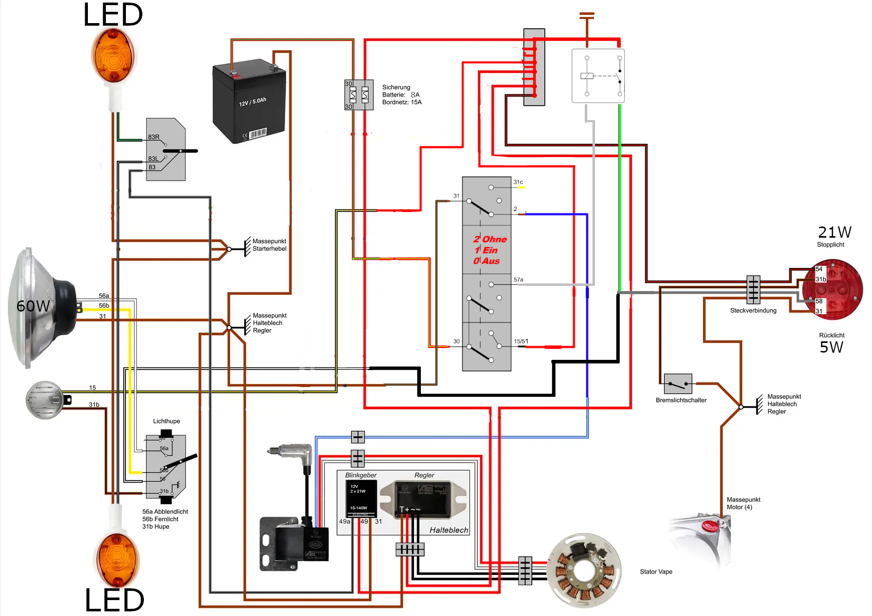 Der Schaltplan basiert auf dem leicht verständlichen Schaltplan für eine PD in einer Schwalbe von mpabsw , dementsprechend passen manche Dinge wie z.B die Blinker oder Steckverbinder nicht ganz.