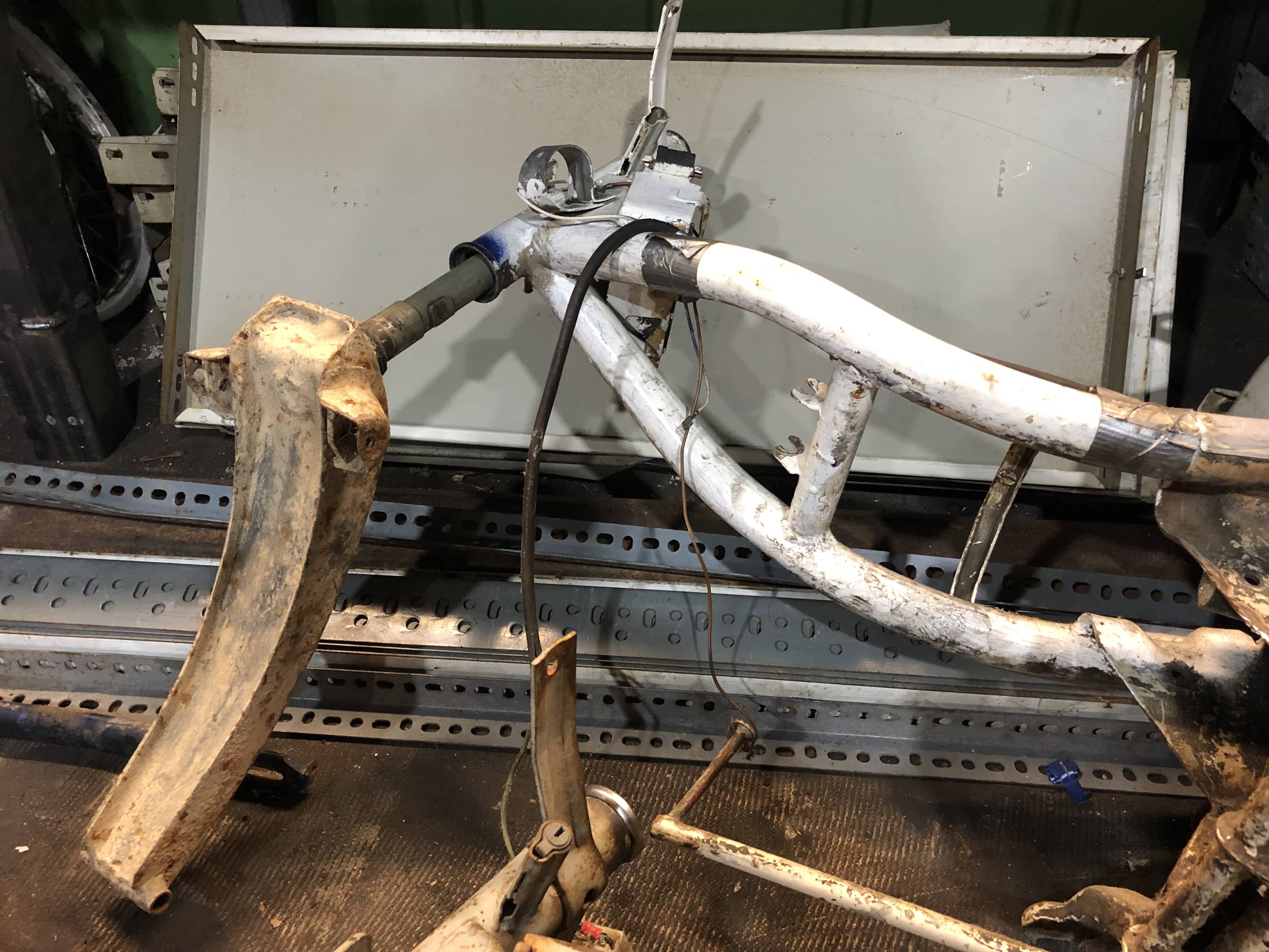 Bei dem unbekannten Rahmen sieht man ganz genau das es sich um einen /2er handelt, die Merkmale sind die teils geprägten Bohrungen für die zwei hinteren Motorschrauben und dann noch das Bremsgestänge bzw hier den passenden Fußbremshebel.
