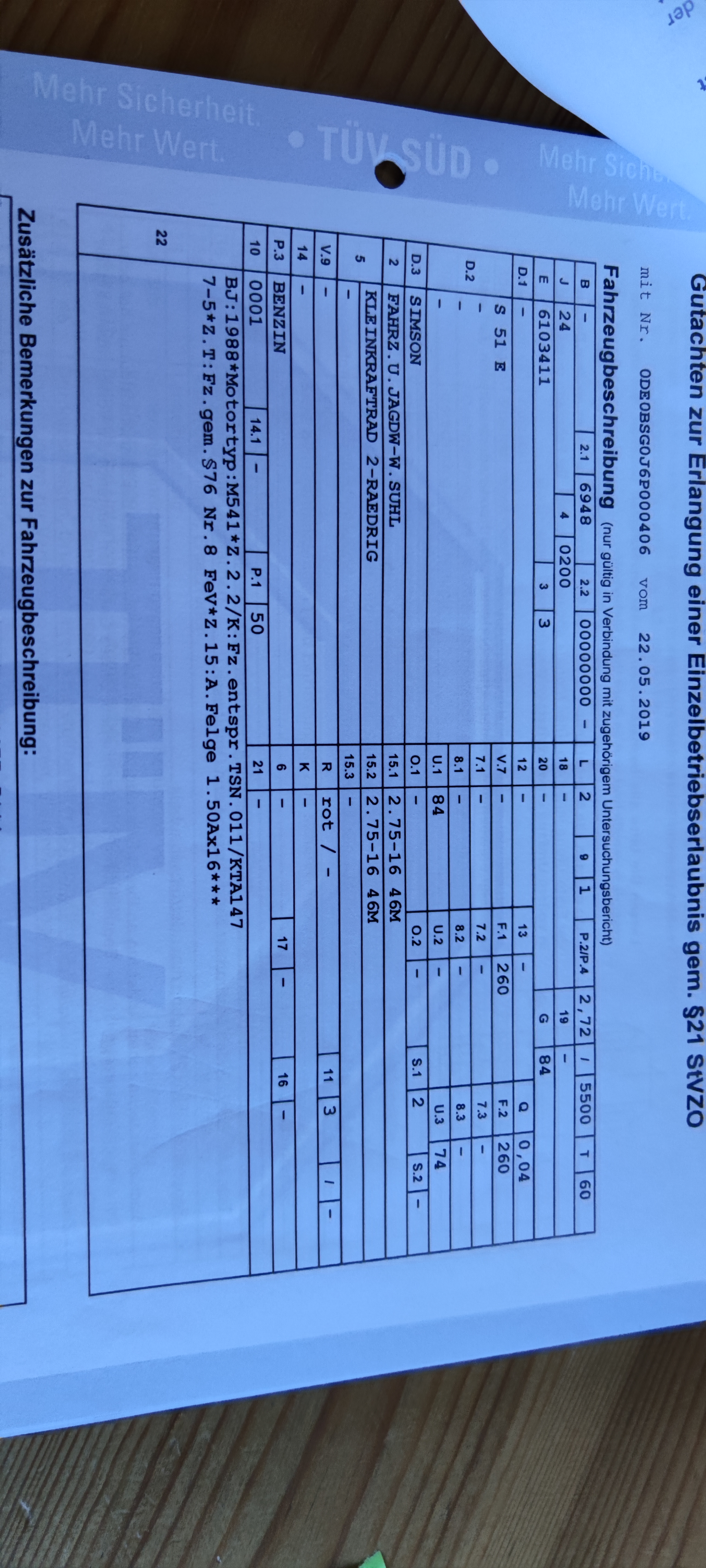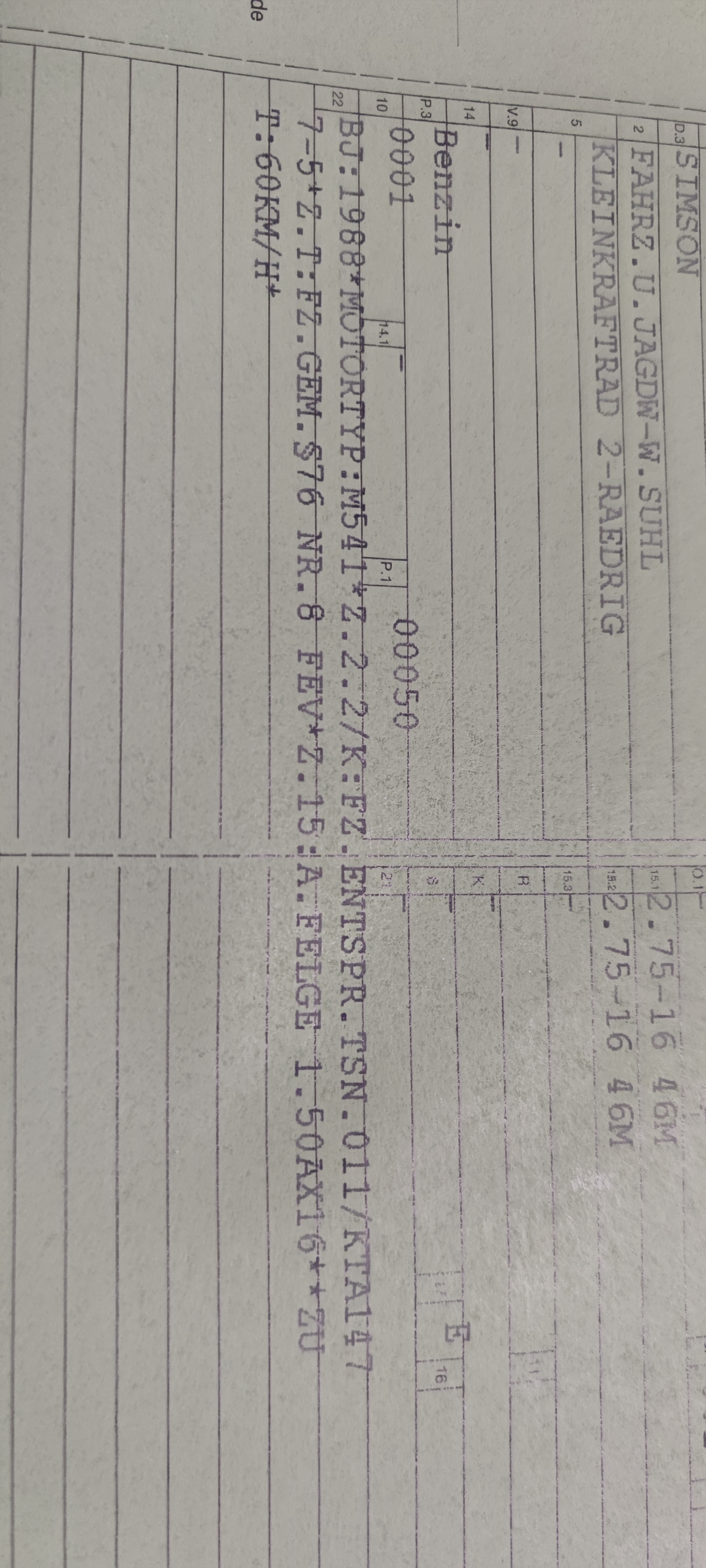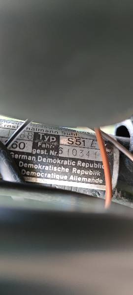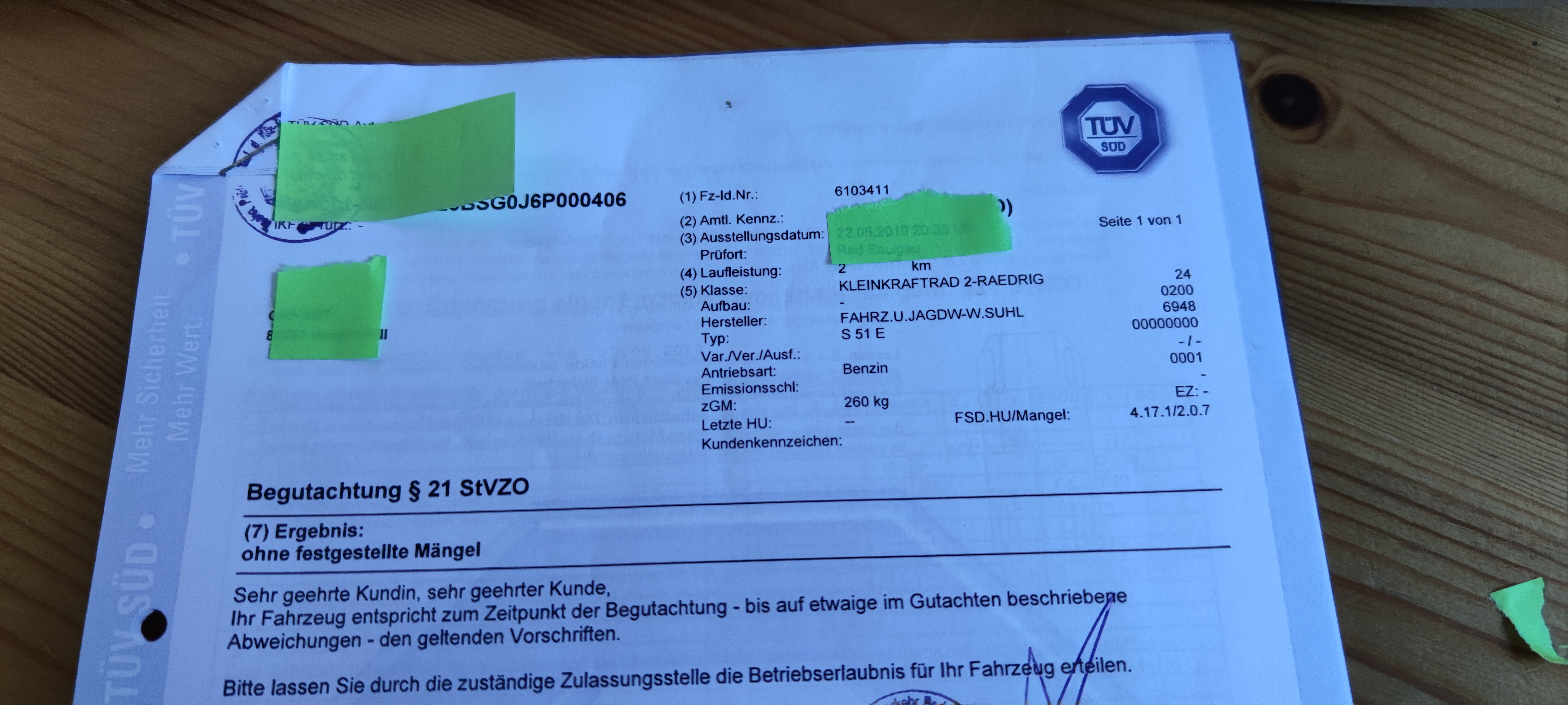 in 05/2019 habe ich das Moped vom Verkäufer gekauft, mit einer Begutachtung vom TÜV nach 21 StVZO und einigen Bildern als Anhang. Damit habe ich vom Landratsamt eine Einzelgenehmigung für eine S51 E erhalten, Kosten ca. 40 €.
