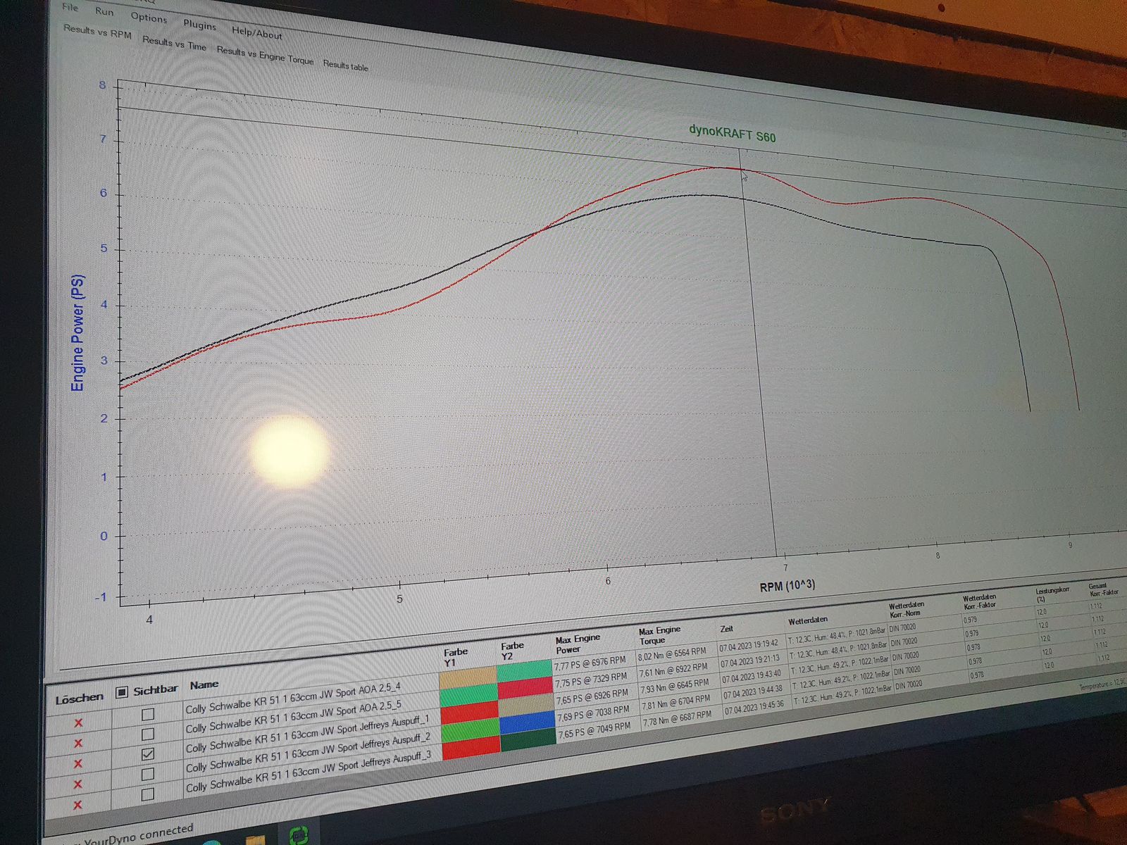 Im Diagramm sind zum Vergleich der JW Sport G85+ (grüne Kurve) sowie ein 95er (rote Kurve) hinterlegt.