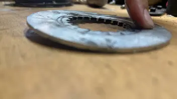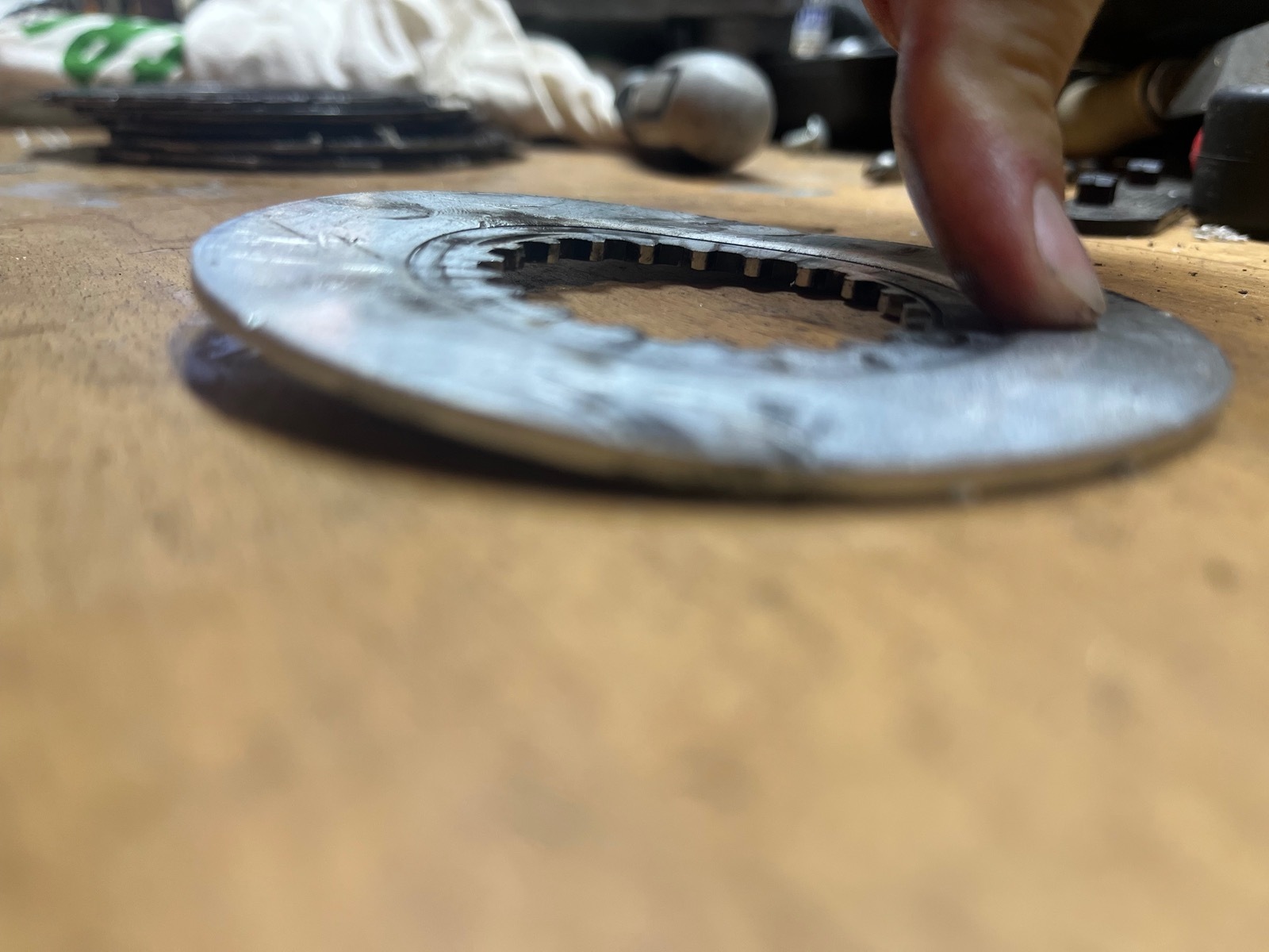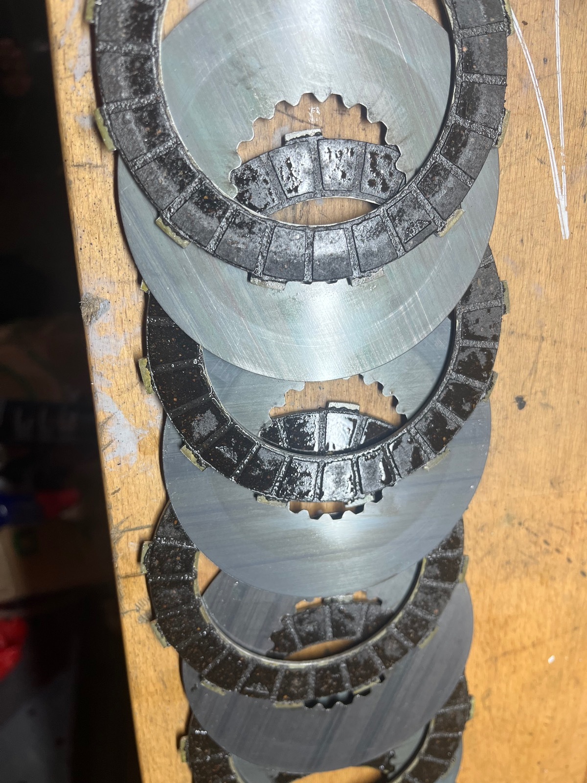 Naja, daraufhin probiert die Kupplung einzustellen, an madenschraube und am kupplungshebel, beides ohne Erfolg. Entweder trennt sie nicht richtig oder sie rutscht eben. Wobei sie auch bei der Einstellung, bei der sie nicht richtig trennte auch im Lastbereich rutschte.Jetzt hab ich mal das Öl abgelassen (sieht normal aus) und wollte die Kupplung ausbauen und anschauen. Als erstes fiel mir auf, dass ich die 20er mutter vom kupplungskorb/primärantrieb lösen konnte ohne das blockierwerkzeug einzuspannen. Die Mutter war einfach lose, darf ja so nicht sein oder? Des Weiteren fiel mir beim entnehmen des kupplungspaketes auf, dass dort zwei anlaufscheiben übereinander lagen, soll da nicht nur eine hin? Des Weiteren fielen mir komische Spuren auf der unteren Platte auf (siehe Bild). Für mich sieht das irgendwie alles andere als richtig aus.