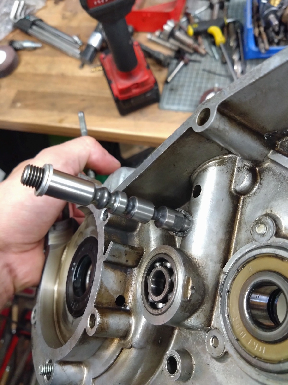 Ich habe die Welle erst kürzlich verbaut, da wärend der Revision aufgefallen ist, dass das Gehäuse an der Stelle gebrochen war. In Summe war die alte Welle 2,2mm zu kurz. Worauf ich die verschraubte bestellt habe. Diese war genau so lang, wie die originale. 2 Scheiben auf die Gewinde-Seite und dann eingeklebt.