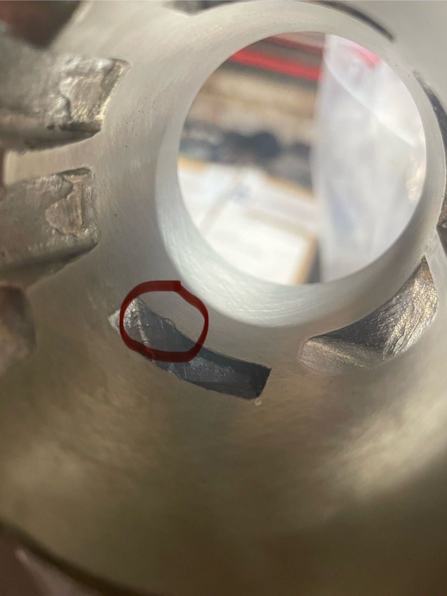 Der zweite Punkt ist das abgeplatzte Stück Nicasil an dem einen Überströmer (erstes Bild). Kann ich das einfach so lassen oder muss ich den Strömer hochfräsen (was natürlich fatal wäre) ?
