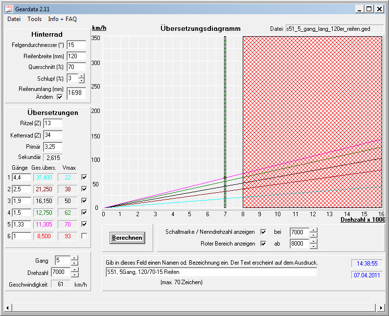 Circa 70km/h bei um die 7500 Umdrehungen-langes MZA 5 Gang
