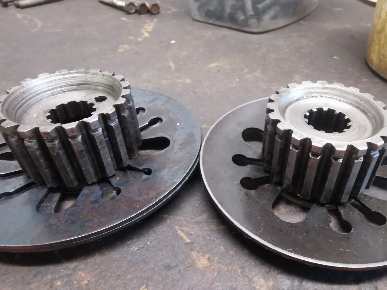 Auf dem Foto ist zu sehen, daß der linke Mittnehmer 3mm tiefer ausgedreht ist als der Rechte. Die innenverzahnung ist dadurch nur 7mm und nicht 10mm. Deshalb steht, im montierten Zustand, die Verzahnung der Welle über dem Mittnehmer und er kann deshalb nicht festgezogen werden.