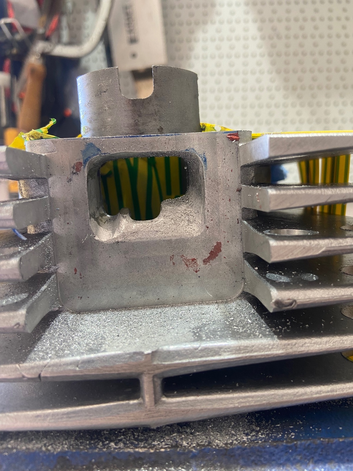 Ziehe denn Einlass jetzt so hoch wie es geht, lasse aber einen kleinen Steg für den Kolbenring.