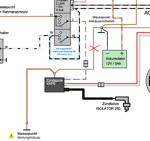 Du willst das rot durchgestrichene Kabel weglassen? Auf keinen Fall! Die Masse ist zwar anscheinend aktuell da, geht aber nur über Umwege über das Motorlager.