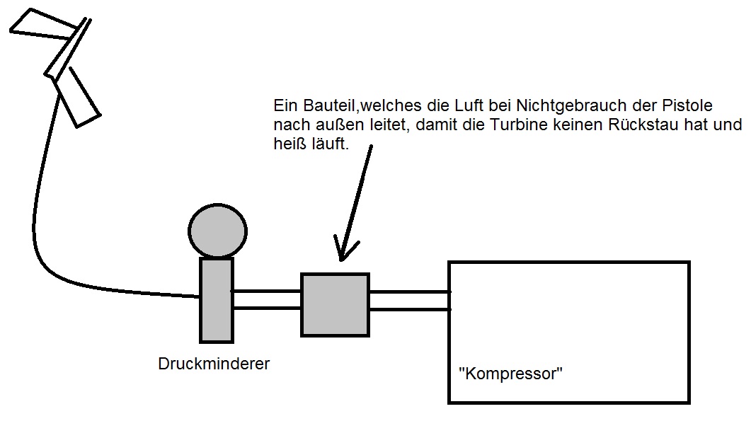 Mein Problem ist aber, dass ich nicht weiß, ob die Luftmenge ausreicht, die Pistole optimal betreiben zu können. Zu viel Luft wäre egal, da man die ja drosseln kann. Ein weiteres Problem wäre ein Ventil, dass die Luft aus dem Luftschlauch ableitet, wenn die Pistole nicht betätigt wird (die originale lässt immer Luft durch, damit es zu keinem Luftstau kommt und die Turbine beschädigt).