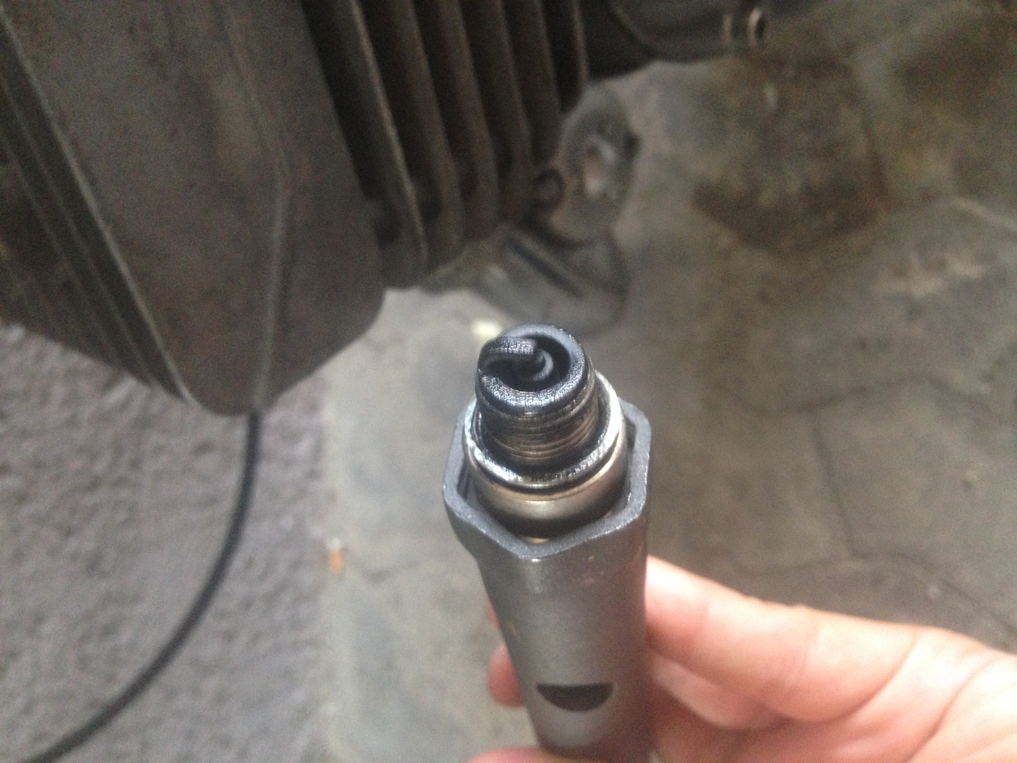 Richtig! Das heisst der Motor läuft viel zu fett? Das Kerzenbild ist deutlich zu dunkel, ich habe die Kerze gereinigt und kontrolliert, dann den Motor angeworfen, und dann die Kerze noch mal angesehen. Sie ist völlig schwarz verrußt und leicht ölig.