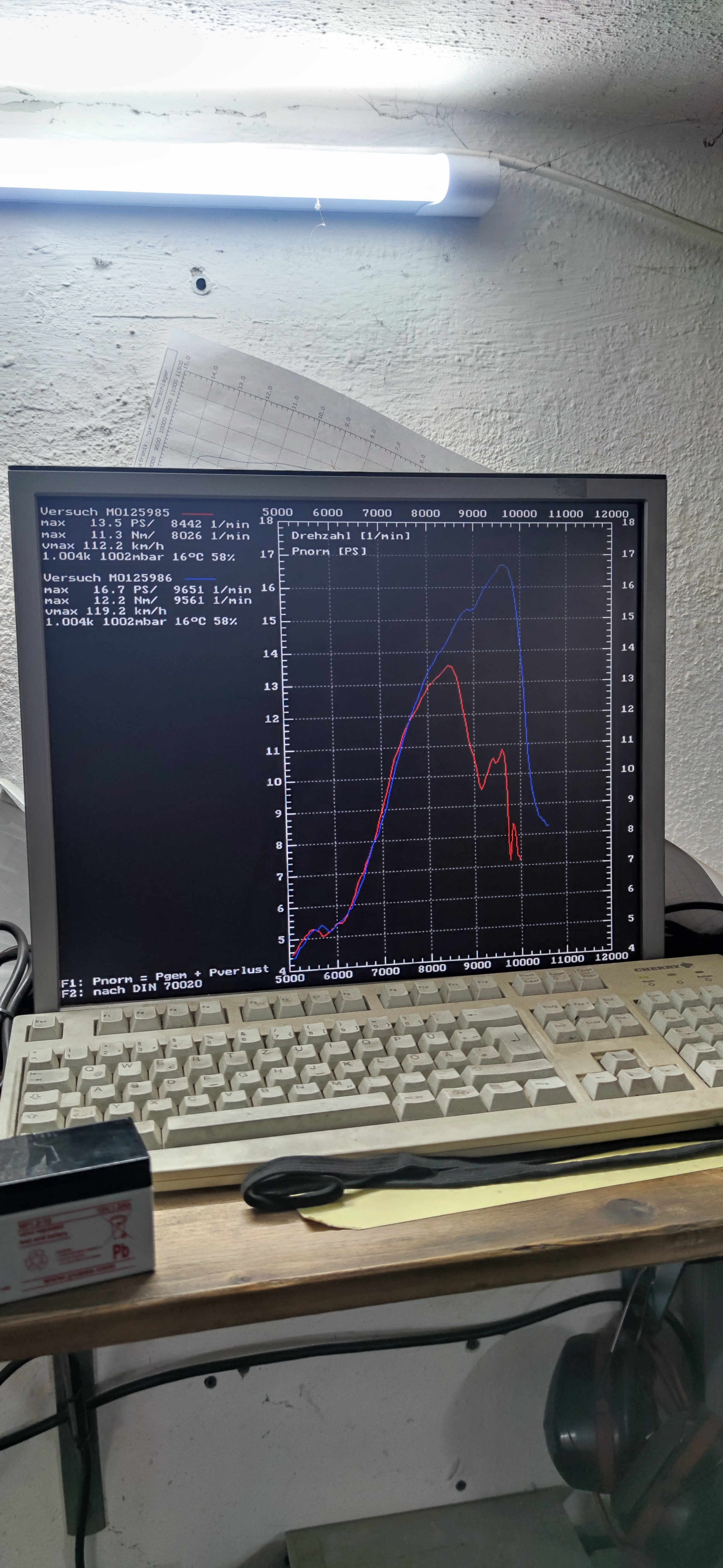 Ich hatte hier die Frage gestellt und mir heute selbst so richtig beantworten können. Ich fahre den Originalen Herzkasten in Verbindung mit dem Gummi auf 20er Mikuni. Da ich gleich einige Sachen mit dem Wechsel auf Mikuni geändert hatte war ich mir sehr unsicher ob es wirklich an dem Verbindungsgummi aka "Luftfilterdrossel" liegt. Das es so deutlich ist hätte ich nicht gedacht. Die Messung sind mit und ohne Gummi. Was mich nur Stark irritiert, ich hatte den Gummi auch so mal abgezogen und eine Runde gedreht. Abgesehen von der Lautstärke wollte das Moped aber mit Halbgas garnicht fahren nur mit komplett offenem Schieber ging's vorwärts. Ich Wechsel nun den Herzkasten und hoffe das ich dann wieder zu den alten Leistungsdaten wie mit dem 20er BVF komme.