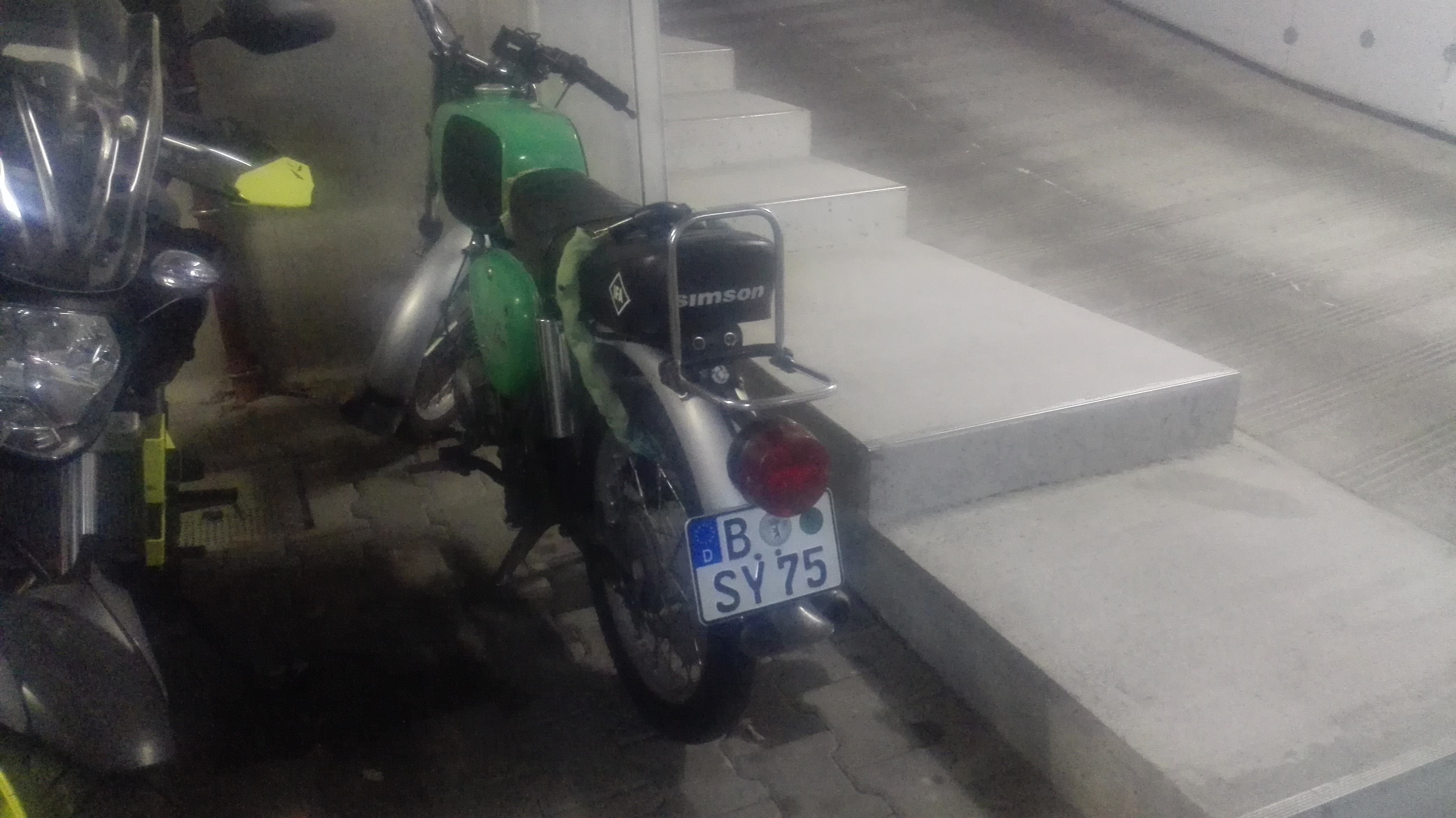 ich wende mich an euch, weil ich einfach nichtmehr weiter weiß. Es geht um meine S50 mit S70 Motor. Das Moped ist seit gestern zugelassen. Allerdings war die Zulassungsstelle in Berlin der Meinung, dass ich leider kein Leichtkraftradkennzeichen fahren kann, sondern ein ganz großes Kraftradkennzeichen brauche. Nach 3h Diskussion mit 4 verschiedenen Leuten, darunter der Technikprofi der Zulassungsstelle, ließ ich mich wohl oder übel erweichen und kaufte troz meines bereits vorhandenen LKR Kennzeichen so einen riesen Oschi. Fahren kann ich jetzt also, nur leider passt das Teil einfach super schlecht an mein Schutzblech und es sieht einfach mega behindert aus. Der springende Punkt an der Sache ist jetzt wohl leider die Schlüsselnummer 2200 "Kraftrad, Leichtkraftrad" in meinem Schein... Aus dieser Eintragung zieht die Zulassungsstelle den Schluss, dass es sich um ein Kraftrad handelt und ich deshalb nur mit einer Ausnahmegenehmigung ein kleines Kennzeichen bekomme. Nun meine Frage: Ist das so korrekt? Ich hab nämlich noch nie eine Simme mit Motorradkenzeichen gesehen und im Internet auch schon gelesen, dass diese Schlüsselnummer eigentlich ausreichen sollte für ein kleines Kennzeichen!